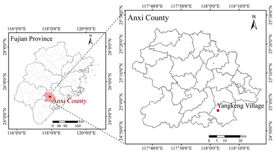 The soil used in the experiment was collected from the Yangkeng small watershed in Longmen town, Anxi County, Fujian Province, Southeast China (Figure 2), with an average elevation of 196 m. The Yangkeng small watershed is characterized by hilly valley landforms, with the rainy season mainly concentrated between May and September. The average annual rainfall is 1800 mm, and the average annual temperature is 19 °C. The frost-free period lasts approximately 330 days throughout the year [27]. The vegetation types in the study area include Masson pine and Eucalyptus trees; understory shrubs of wild peony, myrtle, and Syzygium buxifolium; and herbaceous plants of Dicranopteris dichotoma, Neyraudia reynaudiana, Odontosoria chinensis, and Eriachne pallescens [28]. The soil in this area mainly develops from colluvial deposit. Under the influence of high temperatures and abundant rainfall, the bedrock weathers to form a thick weathering mantle. This mantle has a high coarse particle content, poor structure, and weak erosion resistance. Under the influence of precipitation and gravity, soil slopes easily erode, collapse, and form Benggang landforms. According to the survey, the number of Benggang in Anxi County was 12,828, approximately 50% of the total in Fujian Province. With a density of 40 per km2, the Yangkeng small watershed contains 226 Benggang in total, which is 10 times more than that in Anxi County and 200 times more than that in Fujian Province. With severe rates of erosion that cause increased harm potential, the Yangkeng small watershed has become one of the typical representative areas where Benggang occurs in Fujian Province and even in southern China [27].