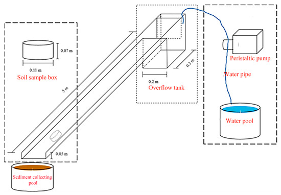 The prepared soil samples were uniformly placed into 500 cm−3 ring molds (diameter, 100 mm; height, 63.7 mm) with a bulk density of 1.4 g cm−3, followed by spraying with the required W-OH solution. After spraying, the samples were left to stand and dry for 72 h. The indoor runoff scouring test is used to simulate soil detachment under controlled conditions, replicating the actual soil erosion process. By precisely measuring parameters, such as soil detachment capacity, flow velocity, and shear stress, this method allows for the scientific quantification of various factors affecting soil detachment capacity and helps explore its variation mechanisms. Following similar methods reported in previous studies [31], a 5 m-long, 0.2 m-wide flume (Figure 3) was used in the flume scouring experiment, with the slope of the flume set to the average slope of the colluvial deposit (30°). On the basis of local rainfall records [32], six flow discharge levels of 4, 8, 12, 16, 24, and 32 L/min (converted into unit flow discharge levels of 0.33 × 10−3, 0.67 × 10−3, 1.00 × 10−3, 1.33 × 10−3, 2.00 × 10−3, 2.67 × 10−3 m2 s−1) were set, with the flow discharge controlled by a peristaltic pump (WT600-4F). Soil samples treated with W-OH solutions of the same concentration were subjected to three scouring tests under each flow discharge condition, resulting in a total of 108 tests. The average of the three measurements was taken as the measurement value for this treatment.