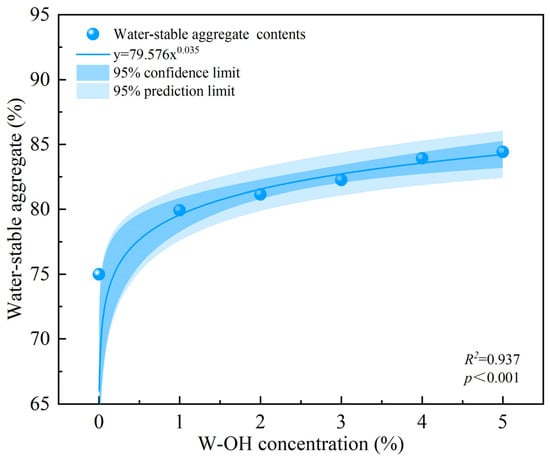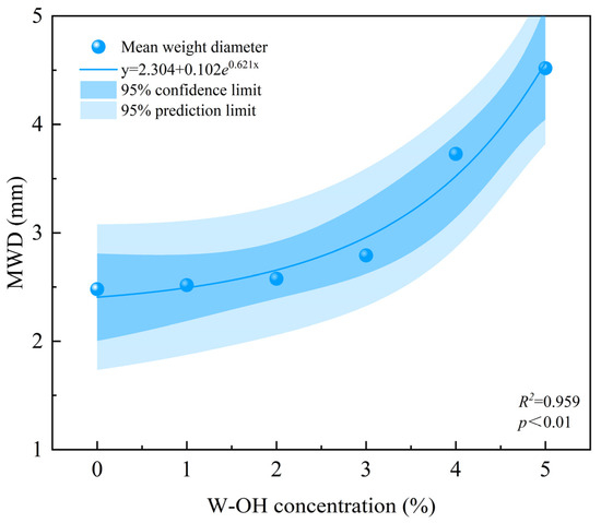 Soil aggregates are the fundamental units of the soil structure, and an increase in aggregates is beneficial for enhancing the soil quality and fertility [36]. After each W-OH solution was sprayed, the content of water-stable aggregates in the experimental soil increased with increasing spray concentration (Figure 4). Compared with that in the control group, after the samples were sprayed with 1%, 2%, 3%, 4%, or 5% W-OH solutions, the content of water-stable aggregates in the soil samples increased by 6.58%, 8.23%, 9.69%, 11.93%, and 12.59%, respectively, suggesting that the applied W-OH solution facilitated the effective aggregation of the loose colluvial deposit soil. The MWD is commonly adopted by researchers to characterize the size and distribution of soil particles [37]. Figure 5 shows the relationship between the MWD of the experimental soil samples and the W-OH concentration. The MWD first slowly increased and then rapidly increased with increasing W-OH concentration. After each W-OH solution was sprayed, the average MWD increased by 30.07% compared with that in the control group. The results indicate that applying the W-OH solution imposes a favorable aggregation effect on the experimental soil, thereby significantly increasing the content of large particles, which benefits nutrient retention in colluvial deposit soil and helps reduce erosion.