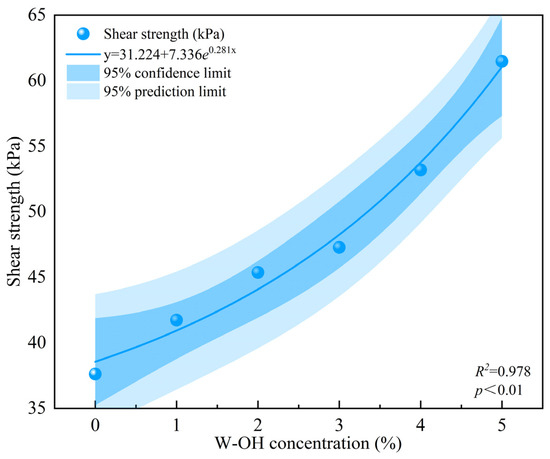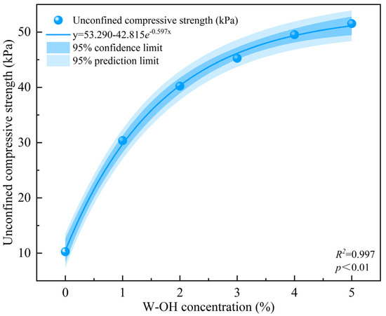 Soil mechanical properties are important factors influencing soil stability and the resistance to erosion. The W-OH solution exhibits satisfactory permeability [17], allowing it to penetrate through the soil pores, providing a solid basis for exploring the impact of W-OH application on the characteristics of the soil strength. Figure 6 shows the relationship between the shear strength of the experimental soil and the W-OH solution concentration. With increasing W-OH solution concentration, the shear strength of the soil samples significantly increased, indicating an exponential relationship. Compared with those of the untreated samples, the shear strengths of the soil samples treated with the 1%, 2%, 3%, 4%, and 5% W-OH solutions increased by 10.95%, 20.62%, 25.70%, 41.41%, and 63.42%, respectively. Figure 7 shows that the unconfined compressive strength of the experimental samples increased rapidly at first with increasing W-OH solution concentration and then slowly increased and eventually stabilized. The relationship can also be modelled by an exponential function. Compared with that of the untreated samples, the average unconfined compressive strength of the soil samples treated with a W-OH solution increased by 322.37%. The above analysis revealed that spraying with W-OH solution effectively enhanced the ability of the soil to resist external forces, and after solidification, the applied W-OH significantly increased the bonding between the soil particles and the soil hardness, thereby reducing erodibility.