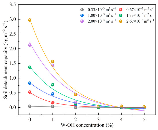 The effect of W-OH concentration on soil detachment capacity under different unit flow discharge conditions.
