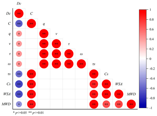 Variable correlation matrix. Dc denotes soil detachment capacity (kg m−2 s−1); C denotes W-OH concentration (%); q denotes unit flow discharge (m2 s−1); v denotes mean flow velocity (m s−1); τ denotes shear stress (Pa); ω denotes stream power (W m−2); τs denotes shear strength (kPa); Cs denotes unconfined compressive strength (kPa); WSA denotes water-stable aggregates (%); MWD denotes mean weight diameter; * represents significant correlation (p < 0.05); ** represents significant correlation (p < 0.01).