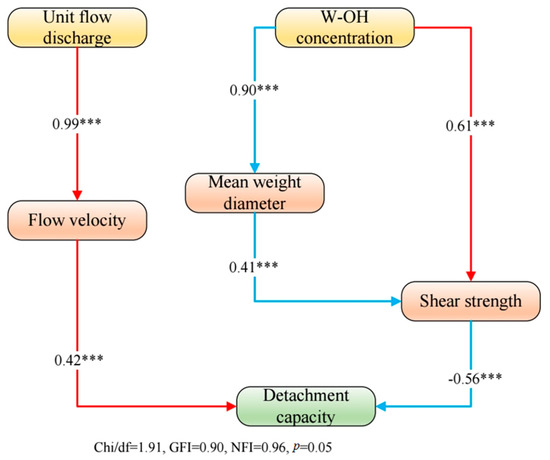 The soil detachment capacity is jointly influenced by hydraulic characteristics and soil properties [39,40]. To investigate the relationships between the soil physical and mechanical properties and the hydrodynamic parameters with the soil detachment capacity, we performed a correlation analysis between the soil detachment capacity and various variables (Figure 9). As shown in Figure 9, the soil detachment capacity was highly significantly negatively correlated with the W-OH concentration, shear strength, unconfined compressive strength, and water-stable aggregate content; significantly negatively correlated with the MWD; and significantly positively correlated with the unit flow discharge, mean flow velocity, shear stress, and stream power. Additionally, we applied the structural equation modelling path analysis method to investigate the mechanism underlying the changes in the soil separation capacity under W-OH spraying (Figure 10). We selected various parameters such as the unit flow discharge, mean flow velocity, W-OH concentration, MWD, shear strength, and soil detachment capacity for model fitting. The reason for choosing these parameters is that, compared with the shear stress and stream power, the mean flow velocity is easier to measure. Furthermore, the MWD is more representative of the overall soil particle size than water-stable aggregates are, and the shear strength is a better indicator of the resistance of soil to lateral water flow than the unconfined compressive strength is. Notably, Figure 10 shows that the Chi/df, P, GFI, and NFI results of the model conform with the structural equation modelling evaluation criteria [41], which indicates that this model is well suited for investigating the logical relationships between the various factors in this study. Moreover, Figure 10 shows that the flow discharge mainly influenced the change in the detachment capacity via the mean flow velocity, which exerts a significant positive effect on the detachment capacity (path coefficient = 0.42, p < 0.001). W-OH application influences the change in the detachment capacity primarily by affecting the shear strength, either directly or indirectly, with the shear strength significantly negatively affecting the detachment capacity (path coefficient = −0.57, p < 0.001).