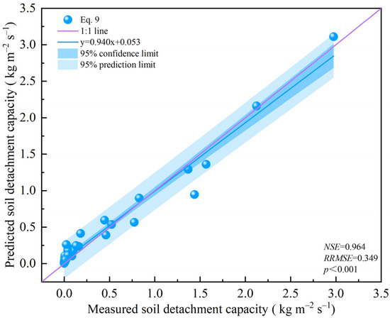 Equation (9) indicates that under the experimental conditions, the W-OH concentration and the unit flow discharge could explain 96.4% of the total variation in the detachment capacity. The Nash–Sutcliffe efficiency (NSE) of Equation (9) is 0.964, and the relative root mean square error (RRMSE) is 0.349, indicating a favorable fitting accuracy. Figure 11 shows the 1:1 line of the predicted detachment capacity versus the measured detachment capacity using Equation (9). The data points occur close to the 1:1 line, indicating a satisfactory accuracy of the prediction equation, and it can be used to predict the detachment capacity with a suitable precision under the experimental conditions. However, it is uncertain how accurate the prediction equation is outside the experimental conditions.