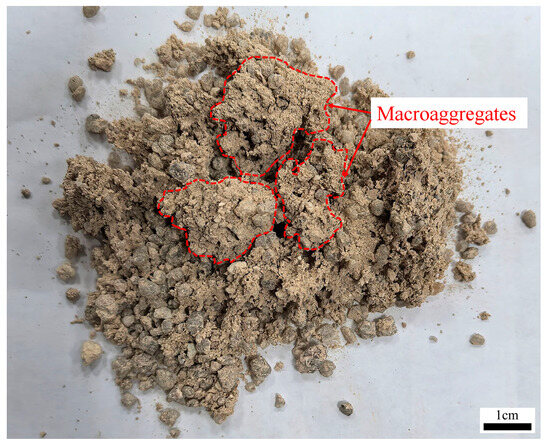 Larger soil particles generally exhibit a greater ability to resist physical forces and are more stable than smaller soil particles are [43]. Figure 4 and Figure 5 show that spraying the W-OH solution significantly increased the proportion of large particles in the soil. This occurs primarily because the polar and active groups in the W-OH solution adhere to the surface of soil particles through physicochemical interactions, creating strong adhesive forces [17], allowing soil particles to bond and form larger aggregates (Figure 12). Zhu et al. found that the particle size of red soil and colluvial deposit soil treated with W-OH increased with the treatment concentration, which is consistent with our research [19]. During soil erosion, fine particles are usually the first to be eroded [44]. The application of W-OH increases the proportion of larger particles in the soil, which contributes to reducing its erodibility.