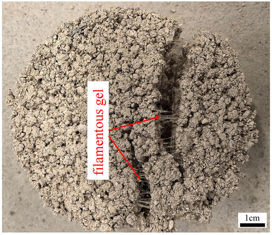 Under the test conditions, the soil detachment capacity decreased exponentially with increasing W-OH concentration (Figure 8). This occurs primarily because as the W-OH solution concentration is increased, its consolidating effect on the soil particles increases, thereby forming a thicker consolidation layer on the soil surface [46]. This enhances the strength properties of the soil and increases its resistance to scouring. Additionally, after W-OH solidification, an elastic gel was produced around the soil particles, which bonded the loose particles together. When the soil is disturbed, the gel between the particles can provide a notable pulling effect (Figure 14), helping to counteract external forces. Table 2 reveals that when the spraying concentration reached 3%, the soil detachment capacity decreased by more than 99% compared with that in the control group. These findings demonstrate that a 3% W-OH solution can effectively prevent colluvial deposit erosion. In simulated rainfall tests, Qin et al. determined that under light and moderate rainfall conditions, the sediment yields at 3%, 5%, and 7% W-OH concentrations were nearly equal, while under heavy rainfall, the sediment yields at 5% and 7% W-OH concentrations were similar [11]. This finding is similar to our results.