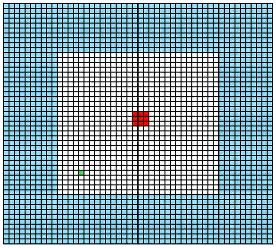 Schematic of the numerical domain used to validate the method. The red cells represent the position of the monopole, the white cells are the physical domain where the simulation is carried out and the cyan cells represent the absorbing domain where the Equation (9) is solved, the green cell is where the microphone is placed and the solution is sampled.