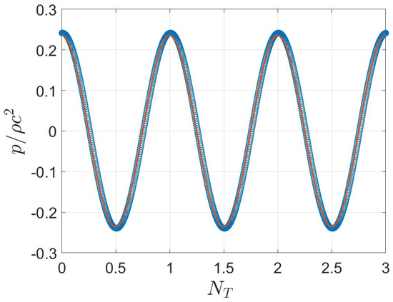 Comparison between the analytical (continuous line) and numerical (circle markers) solution of the monopole. Pressure has been non-dimensionalized with density and speed of sound squared, represents the number of periods of the signal.