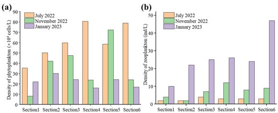Traditional morphological identification of phytoplankton (a) and zooplankton (b) in the study area. Sampling occurred before (July 2022), during (November 2022), and after (January 2023) the spawning season, and different colors represent the three sampling periods.