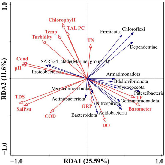 RDA analysis of bacterial top 15 dominant phylum with environmental factors. The blue arrow represents species, and the red arrow represents environmental factors.