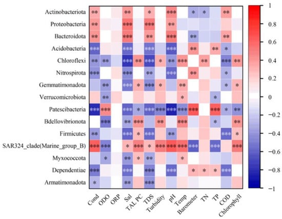Spearman’s correlation heatmap of the top 15 dominant phylum of bacteria with key environmental factors. * p < 0.05 ** p < 0.01 *** p < 0.001.