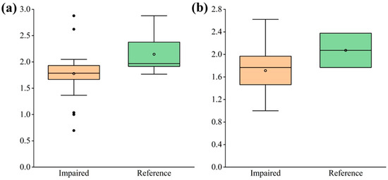 The accuracy of follow-up work hinges upon the selection of reference sites, yet there exists no uniform standard for this selection, leading to significant variation among studies. Some researchers have employed historical data as a basis for selecting reference sites, acknowledging the pervasive impact of anthropogenic activities on ecosystems [30]. However, this method may not be feasible for studies lacking sufficient historical records. Alternatively, previous studies have utilized the relative location of sampling sites to select reference sites, favoring upstream locations farther away from dams [31]. Nevertheless, in this study, the sampling area was located downstream of the Gezhou Dam, with a relatively closer proximity. Furthermore, in conducting multi-period analyses, researchers often opt for different reference sites and evaluation index systems for each time period [32,33]. However, this approach may yield inconclusive results when comparing findings across different periods. For water bodies such as lakes and reservoirs, a scoring method is typically employed to select appropriate reference sites based on common water quality indicators [25]. Nonetheless, this method may be less applicable for more dynamic water bodies like rivers. In conjunction with the results of this study, we noted insignificant differences in indicators among sample sites at the same period and substantial fluctuations in the relative relationship between good and poor water quality for the same site at different periods (Table S2). Therefore, selecting appropriate reference sites in conjunction with the habitat condition of the sampling sites is imperative.