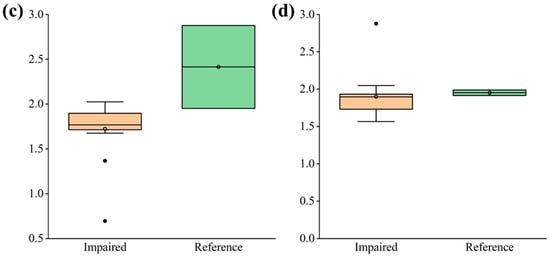Sensitivity analysis of multi-trophic cascade IBI evaluations: (a) IBI scores for all sampling sites grouped by reference and impaired sites for the three time periods; (b) IBI scores for single sampling prior to the spawning season (July 2022); (c) IBI scores for single sampling during the spawning season (November 2022); (d) IBI scores for single sampling after the spawning season (January 2023).