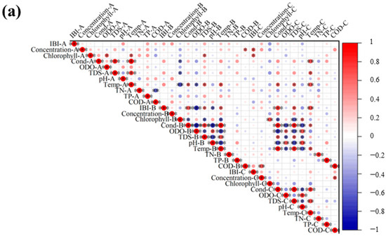 The objective of this study was to develop an IBI evaluation system sensitive to both spatial and temporal factors. To achieve this, we treated indicators at the same sampling point in different periods as independent instead of selecting the average of multiple time periods. Valuable information about ecosystem health can be obtained by analyzing the types and abundance of dominant phyla in a community. Different ecosystems have specific dominant phyla, and changes or imbalances in them may indicate ecosystem stress, pollution, or degradation [39]. The RDA results indicated that the key environmental factors identified were TDS, conductivity, and chlorophyll a concentration (p < 0.05) (Figure 3). Spearman’s correlation heatmap revealed significant correlations between dominant phyla and key environmental factors, except for the Actinobacteria phylum (Figure 4). Based on these results, the relative abundance of the aforementioned phyla was included as a candidate parameter. Empirical indicators involving other trophic levels were also applied, resulting in a total of 33 candidate parameters (Table S3). Three indicators were selected for the indicator system: the index of observed species for fungi, the relative abundance of Basidiomycota, and the relative abundance of Acipenseriformes. To achieve this, parameters with a high number of outliers and zeros, as well as those identified through discriminant power analysis, were excluded. Additionally, biological parameters with overlapping information were excluded using Pearson’s correlation testing. Subsequently, IBI scores were calculated using the disturbance response and ratio method (Table S4), and health evaluation criteria for the study area were determined. The criteria were then applied to evaluate the sampling sites (Table 3).