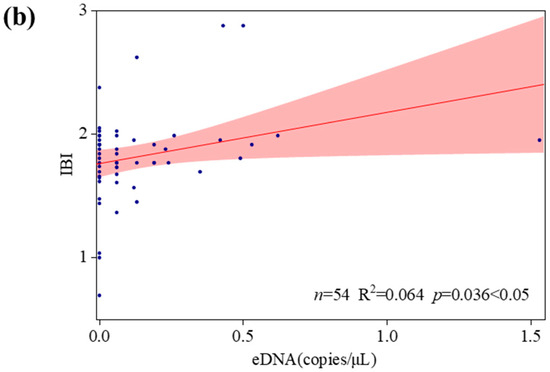In consideration of the distinctive attributes of the study area as a former Chinese sturgeon spawning ground, the concentration of Chinese sturgeon environmental DNA (eDNA) at each sampling site was analyzed in our previous work. This was utilized as an environmental factor for correlation analysis in the current study. Linear correlation was observed between IBI scores and sturgeon eDNA concentrations at all sampling sites (Figure 7). However, this linear relationship is weak. This is largely due to the fact that the eDNA detection rate of Chinese sturgeon is very low, at most points it is 0. Firstly, the population size of Chinese sturgeon in the natural environment itself is very small [50], and secondly, Chinese sturgeon stop feeding during the spawning season [51], which can explain to some extent the weak correlation between IBI values and the concentration of Chinese sturgeon eDNA. Additionally, the results indicated that only IBI scores from the second time period exhibited significant correlations with conductivity, dissolved oxygen (DO), total dissolved solids (TDS), pH, and temperature (Figure 7).