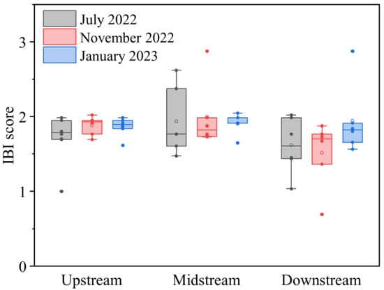 The 18 sampling sites in the downstream section of the Gezhou Dam were categorized into three groups: upstream, midstream, and downstream, to examine the spatial and temporal variability of biological integrity (Figure 8). The outcomes revealed an improvement in biological integrity towards the downstream in all three time periods, implying that the presence of the dam influenced the downstream multi-trophic level biotic composition, with the effect potentially diminishing as the distance from the dam increased. Flow regulation alters the ecological conditions of the watershed, typically promoting the growth of some species that are well adapted to stable environments and reducing the number of species that depend on natural flow variations, leading to changes in species composition [52]. However, there may have been other spatial factors that combined to cause this result that were not discussed in this study. However, from July 2022 to January 2023, the Index of Biotic Integrity (IBI) displayed significantly higher variability in the latter two time periods compared with the first, indicating poorer overall biotic integrity during the initial time period. Specifically, during the first time period, the positivity rate for sturgeon eDNA concentrations was the lowest at 38.89%. In contrast, sturgeon eDNA was detected at more sites during the last two time periods, with rates of 72.22% and 55.56%, respectively. This confirmed the relatively poor biological integrity during the first time period.