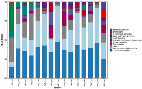 - Yang, Z.; Peng, C.; Cao, H.; Song, J.; Gong, B.; Li, L.; Wang, L.; He, Y.; Liang, M.; Lin, J.; et al. Microbial functional assemblages predicted by the FAPROTAX analysis are impacted by physicochemical properties, but C, N and S cycling genes are not in mangrove soil in the Beibu Gulf, China. Ecol. Indic. 2022, 139, 108887. [Google Scholar] [CrossRef]