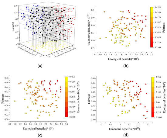 (a) Three-dimensional projection of two-dimensional relationships for Scenario IV; (b) Relationships between ecological and economic objectives in Scenario IV; (c) Relationships between ecological and social equity objectives in Scenario IV; and (d) Relationships between economic and social equity objectives in Scenario IV.