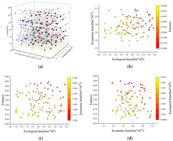 (a) Three-dimensional projection of two-dimensional relationships for Scenario II; (b) Relationships between ecological and economic objectives in Scenario II; (c) Relationships between ecological and social equity objectives in Scenario II; and (d) Relationships between economic and social equity objectives in Scenario II.