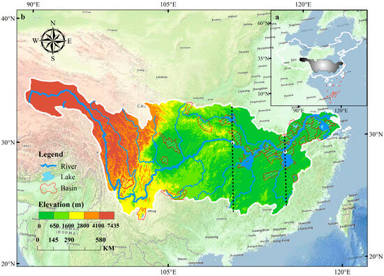The Yangtze River Basin encompasses an area of 1.8 × 106 km2, originating from the Tanggula Mountains on the Qinghai-Tibetan Plateau. The basin exhibits an annual average runoff of 8574 × 108 cubic meters, with a sediment load of approximately 480 × 106 tons. It has an annual average precipitation of around 1045 mm [17]. By 2020, the cultivated land area reached 246,000 square kilometers and terrain sloping from west to east [2]. Based on river channel characteristics and topography, the Yangtze River Basin is divided into three sub-basins (Figure 1): the upper reaches (Yibin to Yichang), the middle reaches (Yichang to Hukou), and the lower reaches (Hukou to the estuary). Land use is predominantly forest (41.0%), with cultivated land mainly concentrated in the Sichuan Basin and the middle and lower reaches of the Yangtze Plain (26.7%). This study selected 33 lakes and reservoirs within the Yangtze River Basin as the research area, covering the upper, middle, and lower reaches, with lakes chosen based on their diverse geographical and climatic characteristics, along with different human activities impacts. For instance, the Taihu Lake basin in the lower reaches represents an economically developed and densely populated area; the Dongting Lake basin in the middle reaches demonstrates intensive agricultural activity; the Poyang Lake basin in the lower reaches exhibits significant seasonal hydrological fluctuations; while the Dianchi Lake in the upper reaches, has higher level of urbanization.