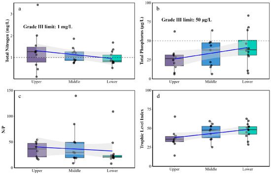 Nutritional status of lakes and reservoirs in different regions of the Yangtze River Basin in 2021, (a) Spatial distribution of total nitrogen (TN) concentrations, (b) Spatial distribution of total phosphorus (TP) concentrations, (c) Spatial distribution of TN/TP ratios, (d) Spatial distribution of the Trophic Level Index. Note: Upper, Middle, and Lower represent the upstream, midstream, and downstream regions of the Yangtze River Basin, respectively. The X-axis indicates the spatial distribution of lakes and reservoirs across these regions, while the Y-axis shows the corresponding nutrient concentrations (TN, TP) or indices (TN/TP, TLI). The blue trend line represents the linear regression analysis of the data. Dashed lines indicate the class boundaries for water quality standards (Class III: TN ≤ 1.0 mg/L, TP ≤ 50 µg/L).