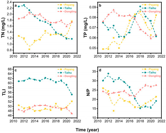 Interannual variations of TN (a), TP (b), TLI (c), and TN/TP (d) in Poyang Lake, Taihu Lake, and Dongting Lake from 2011 to 2021.