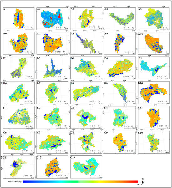 Status of habitat quality for the typical lakes and reservoirs in the upper, middle, and lower reaches of the Yangtze River Basin. Note: A, B, and C represent the upper, middle, and lower reaches of the Yangtze River Basin, respectively; the HQ range of the lakes and reservoirs within the Yangtze River Basin was 0.125–0.468, with the HQ ranges of 0.125–0.468, 0.138–0.320, and 0.135–0.360 for upstream, midstream, and downstream lakes and reservoirs, respectively. Peak HQ values were observed in Shimen Reservoir (A9, 0.468), Zhalin Lake (B10, 0.320), and Taiping Lake (C12, 0.360). Chenghai Lake (A1), Danjiangkou Reservoir (A2), Dianchi Lake (A3), Dongfeng Reservoir (A4), Hongmen Reservoir (A5), Huangge Lake (A6), Liangzi Lake (A7), Lugu Lake (A8), Shijiu Lake (A9), Yinghu Lake (A10); Baihua Lake (B1), Dongting Lake (B2), Fulu Lake (B3), Fushui Reservoir (B4), Hong Lake (B5), Huangge Lake (B6), Liangzi Lake (B7), Xiannv Lake (B8), Zhanghe Reservoir (B9), Zhalin Lake (B10); Beishan Reservoir (C1), Caizi Lake (C2), Chaohu Lake (C3), Ge Lake (C4), Hongmen Reservoir (C5), Huating Lake (C6), Bohu Lake (C7), Poyang Lake (C8), Shengjin Lake (C9), Shijiu Lake (C10), Taihu Lake (C11), Taiping Lake (C12), Wuchang Lake (C13).