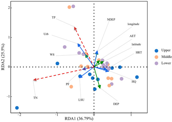 RDA analysis of TN and TP content changes. Figure note: Red arrows represent the response variables TN and TP; blue arrows represent anthropogenic factors; green arrows represent natural factors; and blue Upper, orange Middle, and purple Lower correspond to the upstream, midstream, and downstream regions of the Yangtze River Basin, respectively. Abbreviations: TN (Total Nitrogen), TP (Total Phosphorus), AET (Actual Evapotranspiration), HQ (Habitat Quality), LSU (Livestock Units), HRT (Hydraulic Retention Time), PPT (Precipitation).