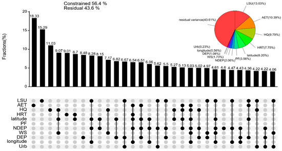 By applying the variance decomposition for further analyzing the impact extent of different factors. Results of variance partitioning analysis (Figure 9) show that AET, HQ, DEP, and Longitude are the main driving factors and explain variance for TN/TP and TLI as 7.8%, 7.3%, 5.1%, and 4.3%, respectively. HRT, NDEP, PPT, Urb, LSU, PF, and Elevation had lower explanations for both parameters, with percentages of 3.1%, 3.0%, 1.1%, 0.7%, 0.6%, 0.6%, and 0.2%, respectively. This study also found a significant negative correlation between DEP and both TLI and TN/TP in the studied lakes and reservoirs, consistent with the findings of Qin et al. [33]. The study found DEP is an important determinant of the nitrogen and phosphorus interplay where relatively deep lakes can facilitate the deposition of phosphorus reducing its concentrations, and contributing to alleviating eutrophication in those regions [10]. Grouping the factors into the human activity and natural impact factor categories indicates that human factors (HQ, HRT, NDEP, Urb, LSU, and PF) explained 15.5% of the variability in TN/TP and TLI in the Yangtze River Basin, whereas the natural factors (AET, DEP, Longitude, PPT, and Elevation) explained 19.8%. Upset plots were generated for each influential factor and interactive effects and contribution for TN/TP and TLI (Figure 8). Results show a strong interaction of AET, HQ, and HRT with a joint explanation of 3.9%. In addition, the primary contributions to explaining the change in both TLI and TN/TP are mainly AET, HQ, and HRT with proportions of 7.8%, 7.3%, and 3.1%, respectively (Figure 8). Figure 7 shows that the upstream lakes and reservoirs were mainly distributed along the negative direction of the first axis, indicating relatively lower TN/TP and TLI, thereby indicating that the overall trophic state was better compared to lakes downstream of the Yangtze River basin.