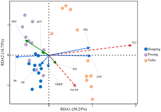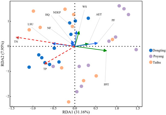 RDA analysis of TN, TP, and the potential environmental drivers in Poyang, Taihu, and Dongting Lakes from 2011 to 2021 revealed that the RDA model explained 39.11% of the variance in TN and TP changes, with the first axis accounting for 31.16% of the variance and the second axis explaining an additional 7.95% (Figure 7). Changes in nitrogen and phosphorus nutrient loads over the past decade were primarily driven by PPT, LSU, PF, NDEP, and AET. The higher the precipitation, the greater the amount of nutrients washed into the lakes and reservoirs. Sinha & Michalak’s study revealed that precipitation was a primary driver for the interannual variation in river nitrogen loading [45]. AET mainly affects lake nutrient concentrations by altering regional hydrological conditions and causing more frequent occurrences of blue-green algal blooms in water [46]. LSU increases nutrient loads into water bodies via animal feed and manure [47,48], PF tends to cause accumulation of phosphorus in soils, where the phosphorus is then evaporated into the atmosphere or leached from soils through groundwater or surface runoff, ultimately significantly affecting its contents in adjacent streams and rivers [49]. Regarding PPT, one of the selected key driving factors, strengthening soil and water conservation, and constructing lakeside buffer zones will help in reducing nutrient discharge caused by storm surges. With regards to AET, the key driving factor identified in the study, actions such as ecological water replenishment and control of water resource consumption need to be taken to mitigate the impact of evapotranspiration. For the identified critical drivers of LSU, manure from animal production should be treated using techniques of controlling animal stocking and promoting utilization of their manure. For identified critical driver PF, we encourage the substitution of organic fertilizer for the use of phosphorus fertilizers to limit the loss or excessive usage of these materials in the region.
