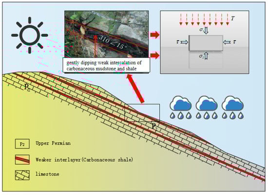 China possesses abundant mineral resources, particularly high-quality limestone deposits located in the southwestern provinces of Yunnan, Guizhou, and Sichuan [1,2]. These deposits typically display a multi-layered structural grid [3,4], which contributes to the presence of numerous Permian limestone strata characterized by gently dipping weak interlayers [5,6]. This type of weak interlayer is typically composed of mudstone or shale that contains mineral components such as carbonaceous, siliceous, and sandy materials. Its mechanical properties are inadequate, and its rheological effects are quite significant [7]. Furthermore, the long-term impact of complex factors—such as repeated temperature cycles, rainfall infiltration, and chemical influences—on the weak interlayer can lead to instability and landslides in mine slopes, thereby presenting considerable safety hazards for open-pit mining [8], as illustrated in Figure 1, where represents the temperature effect on the weak interlayer, and denote the normal stresses, and indicates the shear stress on the weak interlayer. In recent years, numerous scholars have conducted extensive research on the experimental characteristics of shear creep in soft rock. Li et al. [9,10] utilized on-site monitoring, indoor rheological tests, numerical simulations, and theoretical analyses to demonstrate that the wet–dry cycle of rainfall and blasting vibrations significantly deteriorates the rheological characteristics of weak interlayers. Ma et al. [11], based on special engineering of geological conditions of a cut-slope area at the Heitanping hilly pass along the Yongzhou—Jishou highway, have studied the shear creep properties of a weak interlayer in this slope (about 30 m deep) by shear creep test to obtain shear creep curves. A shear creep constitutive model can be obtained by using a stationary parameter fractional derivative Burgers model, and long-term shear strength of the weak interlayer can be determined after the analysis of the shear creep curves. Gao et al. [12] conducted multi-stage shear creep experiments on joints subjected to various wet–dry cycling conditions and discovered the increasing wetting–drying cycles lead to a porous and disintegrated microstructure of joints, which further results in increases in shear deformation and steady-creep rate and decreases in the failure strength and long-term strength. Gutiérrez-Ch et al. [13] analyzed the application of the discrete element method (DEM) in combination with the Realistic Pore-structure Theory (RPT) for simulating rock shear creep (RSC). The findings indicated that the DEM–RPT approach can effectively reproduce all stages of RSC, including the tertiary creep phase. Additionally, the study examined the effects of applied shear stress and normal stress on RSC.