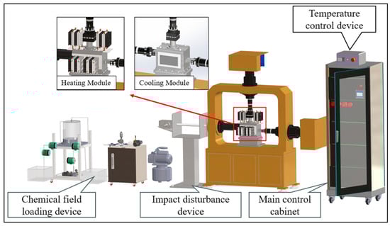 The experiment was conducted using the THMC-B (Temperature, Hydro, Mechanics, Chemical and Blasting vibration) multi-field coupling simulation equipment designed for soft rock shear rheology, as illustrated in Figure 2. This specialized system simulates soft rock shear creep under the combined effects of stress, rainfall, blasting, seepage, and chemical interactions. In the experiment, the temperature field is primarily regulated through two components, the cooling module and the heating module, as illustrated in Figure 2. Throughout the experiment, the heating and cooling modules are periodically attached to the exterior of the shear box to facilitate temperature cycling. The temperature regulation range of this device spans from −20 °C to 75 °C, with an accuracy of 0.1 °C.