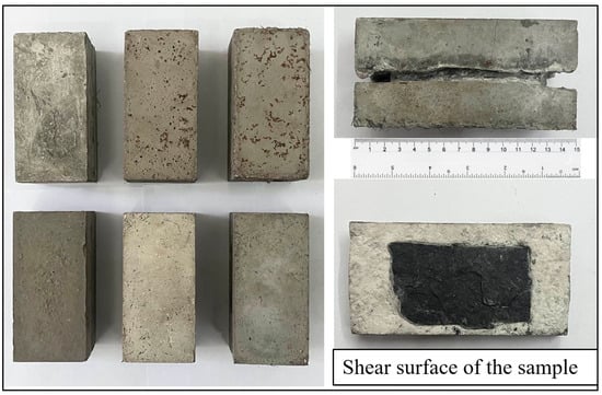 The experimental rock samples were derived from the carbonaceous mud shale of the Permian system, which was collected from the exposed weak interlayers on the slope of the Huangshan limestone mine in Emei City, Sichuan Province. This type of rock primarily consists of limestone debris, sand, and a carbonaceous clay matrix. The rock surface is largely free of visible joints and appears blackish-gray in its natural state. Carbonaceous mud shale samples of suitable size were cut into large, irregularly shaped weak interlayer shear rheology specimens using a large flexible interlayer cutting device, resulting in 45 rectangular specimens measuring 150 mm × 75 mm × 75 mm, as shown in Figure 3.