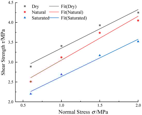 After the testing, data from the direct shear tests were utilized to plot curves of normal stress versus shear strength for carbonaceous mud shale under different moisture content conditions, as illustrated in Figure 4. The internal friction angle and cohesion of the corresponding carbonaceous mud shale were calculated and presented in Table 2. Analysis of the test data indicated that the shear strength of carbonaceous mud shale exhibited a linear growth trend with a continuous increase in normal stress. Furthermore, moisture content was found to have a negative correlation with all basic mechanical parameters of the rock.