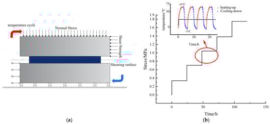 This paper employs a staged loading method to apply shear loads [30]. Based on conventional direct shear test data for carbonaceous mud shale, five distinct levels of shear force were established. The applied shear loads corresponded to 13%, 27%, 40%, 53%, and 67% of the shear strength of the rock samples [31]. Each loading level was maintained for 24 h, with the first four levels averaged across 16 temperature cycles. Specific shear creep experimental data are presented in Table 3, while the simplified design diagram of the experimental scheme is depicted in Figure 5a, and the stress loading path, using natural shear stress as an example, is illustrated in Figure 5b.