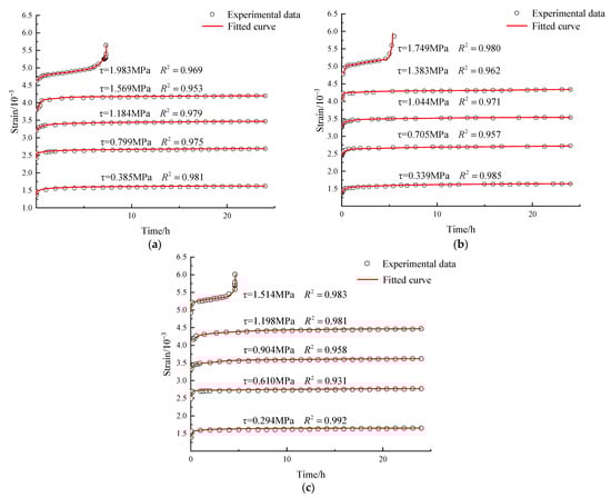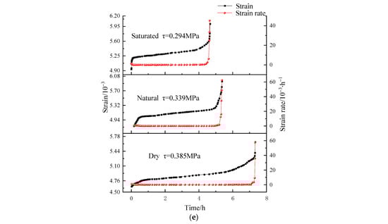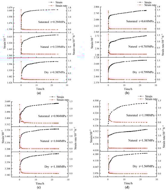 Following the experiment, the strain–time curve was derived from the shear creep experimental data of carbonaceous mud shale at varying water contents, as illustrated in Figure 6.