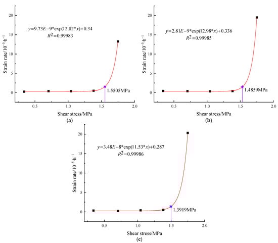 The curve reveals that the steady-state creep rate of carbonaceous mud shale approximately follows an exponential function with respect to shear stress, the fitted exponential function is shown in Figure 9. During the initial stages of loading, the creep rate increases gradually and approaches a linear trend. As the shear stress nears the critical long-term strength of carbonaceous mud shale, the creep rate escalates rapidly until the rock sample is sheared. Following the fitting process, the long-term strength of carbonaceous mudstone under varying water content conditions was evaluated based on the mutation points of the steady-state rate curve, yielding values of 1.5505 MPa, 1.4859 MPa, and 1.3919 MPa. This indicates that, under temperature cycling, the long-term strength of carbonaceous mud shale diminishes as water content increases. Consequently, under temperature cycling conditions, increased water content exerts a significantly adverse effect on the long-term strength of carbonaceous mud shale, serving as a potential factor for slope failure and impacting the long-term stability of mine slopes.