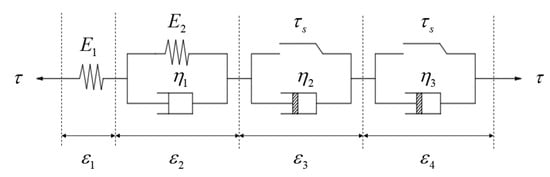where and represent the elastic moduli, , , and are the viscous coefficients, , , , and denote the strain in each component of the model, and correspond to shear stress and long-term strength, respectively, is the time required for soft rock to reach the long-term strength critical point, is the unit time, and is the creep index.