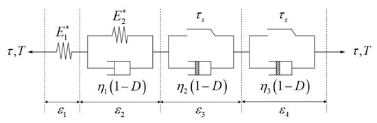 Although the model effectively describes the deformation characteristics of soft rock during the deceleration, steady-state, and acceleration creep stages in shear creep processes, it does not adequately capture the influence of water content on the creep behavior or the damage effects induced by complex stress conditions encountered in real-world scenarios. To address these limitations, this study (1) incorporates a damage component into the combined model to represent the evolution of rock damage due to water content under temperature degradation, thereby adjusting the viscosity coefficient, and (2) recalculates the elastic modulus of the Hooke body within the model to account for the damage effects of water content under temperature cycling [47]. These modifications yield a combined model that integrates both the damage characteristics and the viscoelastic–plastic properties of soft rock, as illustrated in Figure 11.