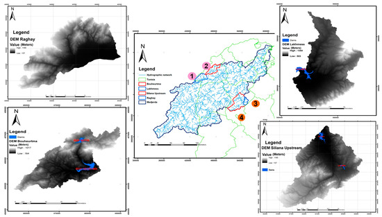 The topography of the study catchments is demonstrated within the Digital Elevation Model (DEM) provided by the Advanced Spaceborne Thermal Emission and Reflection Parameter (ASTER) DEM, with a 30 m resolution, from the mission of 19 June 2014. This model, with a fine grid mesh resolution, allows us to outline to the latitude of any point at Raghay. These DEMs were clipped using version 10.2 of the ArcGIS software to present the gradient of altitude and to probe the drainage network and the direction of slopes of the terrain within the studied catchments.