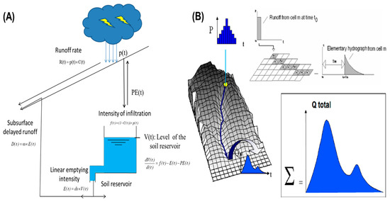 The processes of the SCS-SMA runoff model (A) [32] and the simple LR Model (B). (www.athys-soft.org, accessed on 2 February 2024).