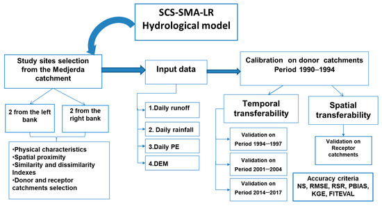 In this paper, we further assessed the use of the SCS-SMA-LR model by testing its parameter transferability for variable spatial and temporal conditions, thereby highlighting its robustness and accuracy for various ungauged catchments and different durations. The Medjerda catchment, a transboundary South Mediterranean catchment, is characterized by a semi-arid climate and significant hydrological variability, bringing additional challenges in testing parameter transferability and the robustness of the selected hydrological model.