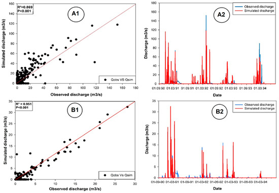 Scatter plot and timeline presentation of the calibration on the period 1990–1994 for the donor catchments using daily discharge: (A1) the scatter plot of the observed versus simulated daily discharge in the Raghay catchment; (A2) the comparison between the simulated and observed continuous timeline discharge in the Raghay catchment; (B1) the scatter plot of the observed versus simulated daily discharge in the Lakhmess catchment; (B2) the comparison between the simulated and observed continuous timeline discharge in the Lakhmess catchment.