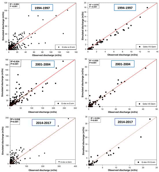 The scatter plot of the observed versus simulated daily discharge in the two donor catchments for the temporal transferability assessment. The left part of the figure concerns the Raghay catchment, and the right part concerns the Lakhmess catchment. Diachronic analysis is shown for three time intervals: 1994–1997, 2001–2004, and 2014–2017.