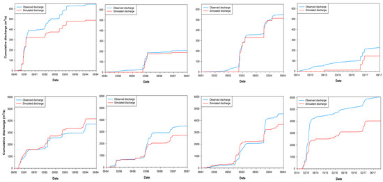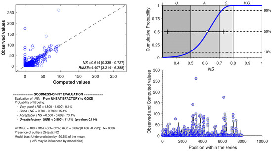 For the validation interval 2001–2004, a slightly better simulation performance is obtained for the Raghay catchment compared to the 1994–1997 receptor interval. The NS in this case yields 67%. The model still underestimates the peak flow by about 30%. The slight variation in the accuracy criteria may be due to climatic variability; during the 2001–2004 period, the Medjerda catchment experienced several high flood events, giving a cumulative rainfall that largely exceeded the annual average of the majority of the study region [64]. This is noticed when observing the maximum flows. In the Raghay catchment, a flow of 357 m3/s was observed, while the peak simulated flow of the model was 247 m3/s.