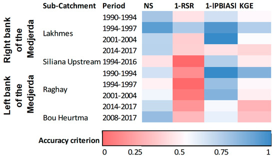 The mean annual rainfall showed a drastic decrease in the Lakhmess catchment of approximately 33% from the period of observation 2001–2004 compared with the period 2014–2017. However, the mean annual rainfall remains comparable for the observed duration of 1990–1994 and 1994–1997, respectively. This variability proved important climate shifts within the studied catchments and the need for temporal transferability. Moreover, recent studies showed an important alteration in Land Use/Land Cover (LULC) within the studied catchments. However, El Ghoul et al. [38] showed that the variability in LULC can be contained within the model prediction uncertainty.