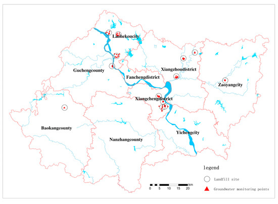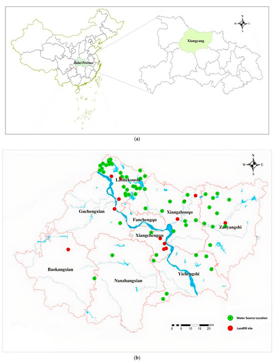 (a) Location of study area. (b) Distribution of landfill and groundwater drinking water sources in Xiangyang City.