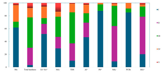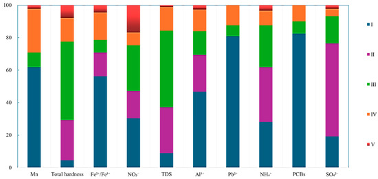 The comprehensive-index evaluation provided a broader perspective by integrating pollution levels across multiple indicators. This assessment revealed that heavy metals such as lead and arsenic, along with organic pollutants like polychlorinated biphenyls (PCBs), were the dominant contributors to groundwater degradation. The findings indicated that a significant portion of samples were Class I (27.0%), with no Class II or III water observed near the landfill sites. The majority of samples were classified as Class IV (46.1%), followed by Class V (27.0%). These proportions reflect the significant prevalence of poor to extremely poor water quality in landfill-affected regions. The results emphasize the critical need for robust pollution control measures to mitigate groundwater contamination surrounding landfill sites.