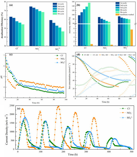 (a) Desalination efficiency of each anion in its individual MDC during 5 cycles; (b) recovery ratio of each anion in each cycle and after the membrane was washed in its individual MDC during 5 cycles; (c) pH changes in the anode chamber of three anionic MDCs in a cycle; (d) anion concentration changes in three anionic MDCs in the desalination chamber and the anode chamber within 110 h; (e) MDC current density changes over 5 cycles of operation of 3 anionic MDCs. (CC: cathode chamber; DC: desalination chamber).
