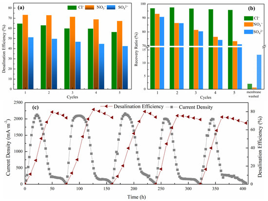 (a) Desalination efficiency of each ion in 5 cycles of composited anion MDC; (b) recovery ratio of each ion in 5 cycles and after membrane washing of composited anion MDC; (c) MDC current density and desalination efficiency of composited anion MDC changes over 5 cycles of operation.